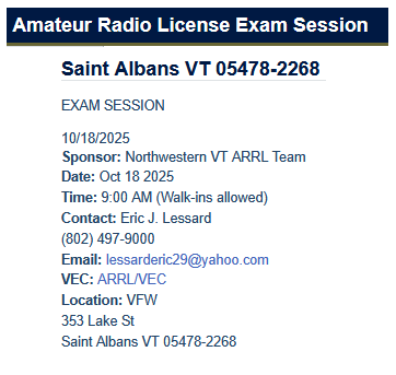 The Northwestern VT ARRL VE Team will be having a test session Saturday, October 18, 2025, at 9:00 am, at the VFW post 758, 353 Lake Street, Saint Albans, VT 05478-2268.